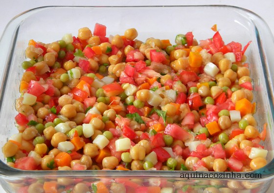 Depois de cozido você pode fazer um tempero e juntar ao grão de bico, mas se quiser fazer a salada acima, separe duas xícaras (de chá) do grão de bico, escorra na peneira, espere esfriar e use na receita.
