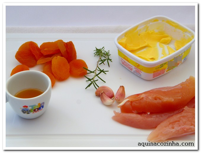 Coloque o damasco de molho na água por pelo menos 1 hora. Enquanto isso tempere o frango com o alho, o alecrim e o sal e deixe descansado 1/2 hora para pegar melhor o sabor.