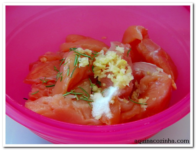 - Usei 1 kg de frango porque aqui em casa somos em cinco pessoas e fiz para todos. Mas, se você quiser fazer só para você e seu amor, divida a receita ao meio.