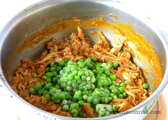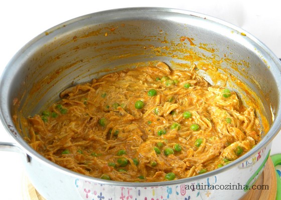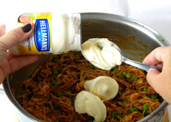 - Em seguida, volte o frango desfiado para o molho, acrescente a ervilha e a maionese.