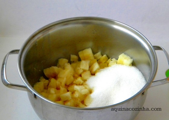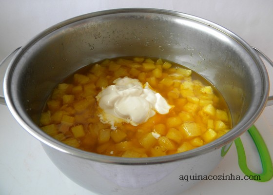 - Coloque o abacaxi picado com a água e o açúcar em uma panela e leve ao fogo. Deixe ferver por 15 minutos. Desligue o fogo e acrescente a gelatina, misture bem até dissolver completamente. Junte o creme de leite sem soro e misture novamente. Coloque em um recipiente (bonito e que possa ir à mesa). Tampe e leve à geladeira até endurecer, cerca de 3 horas.